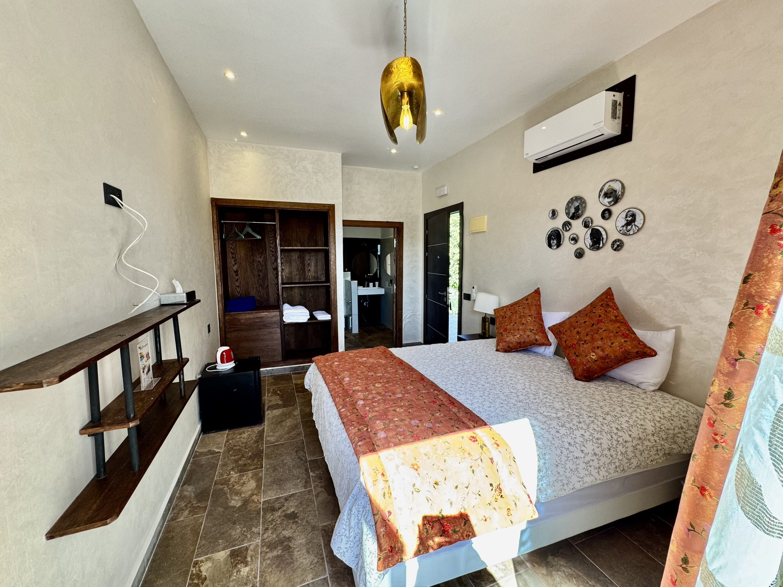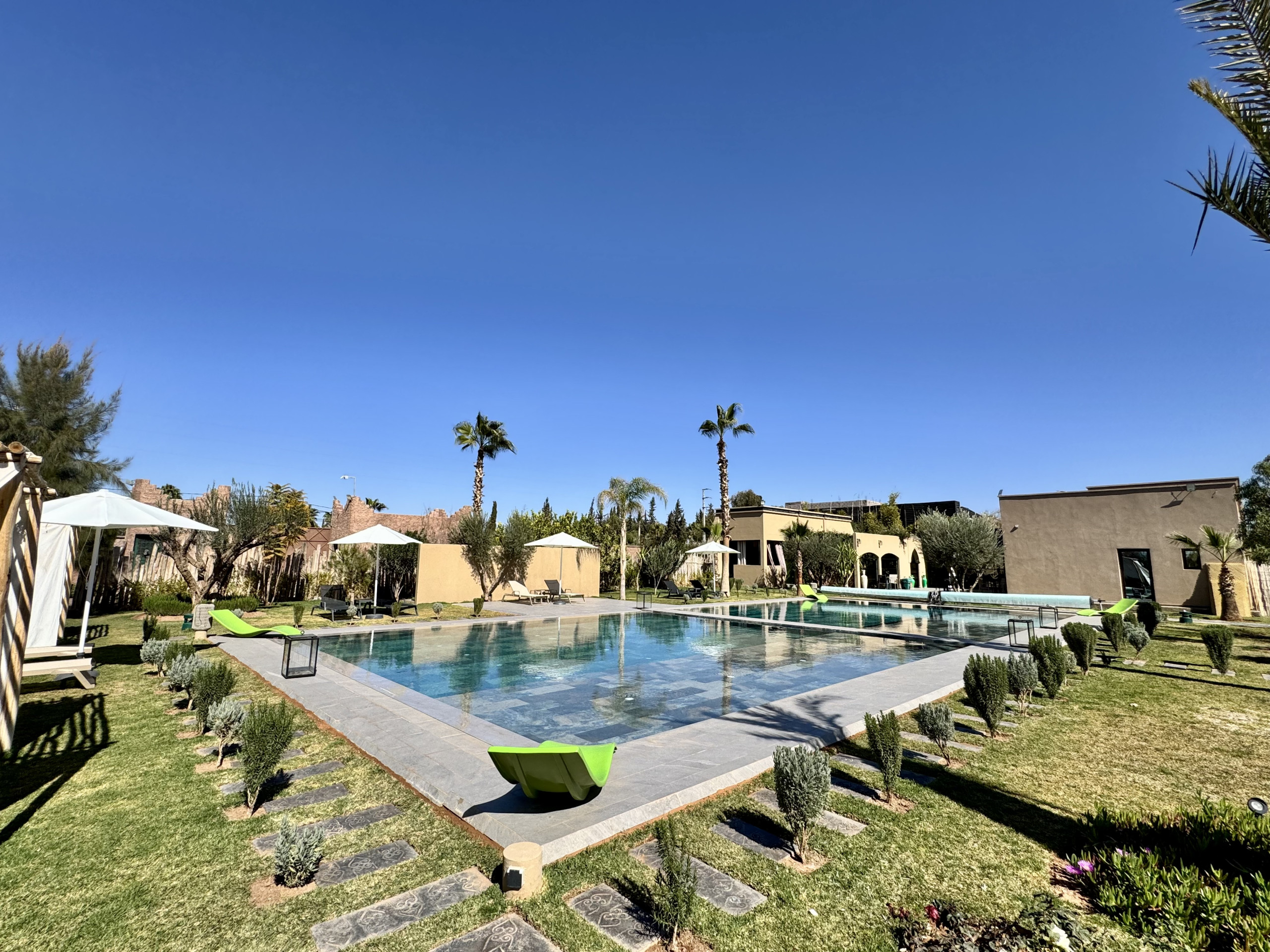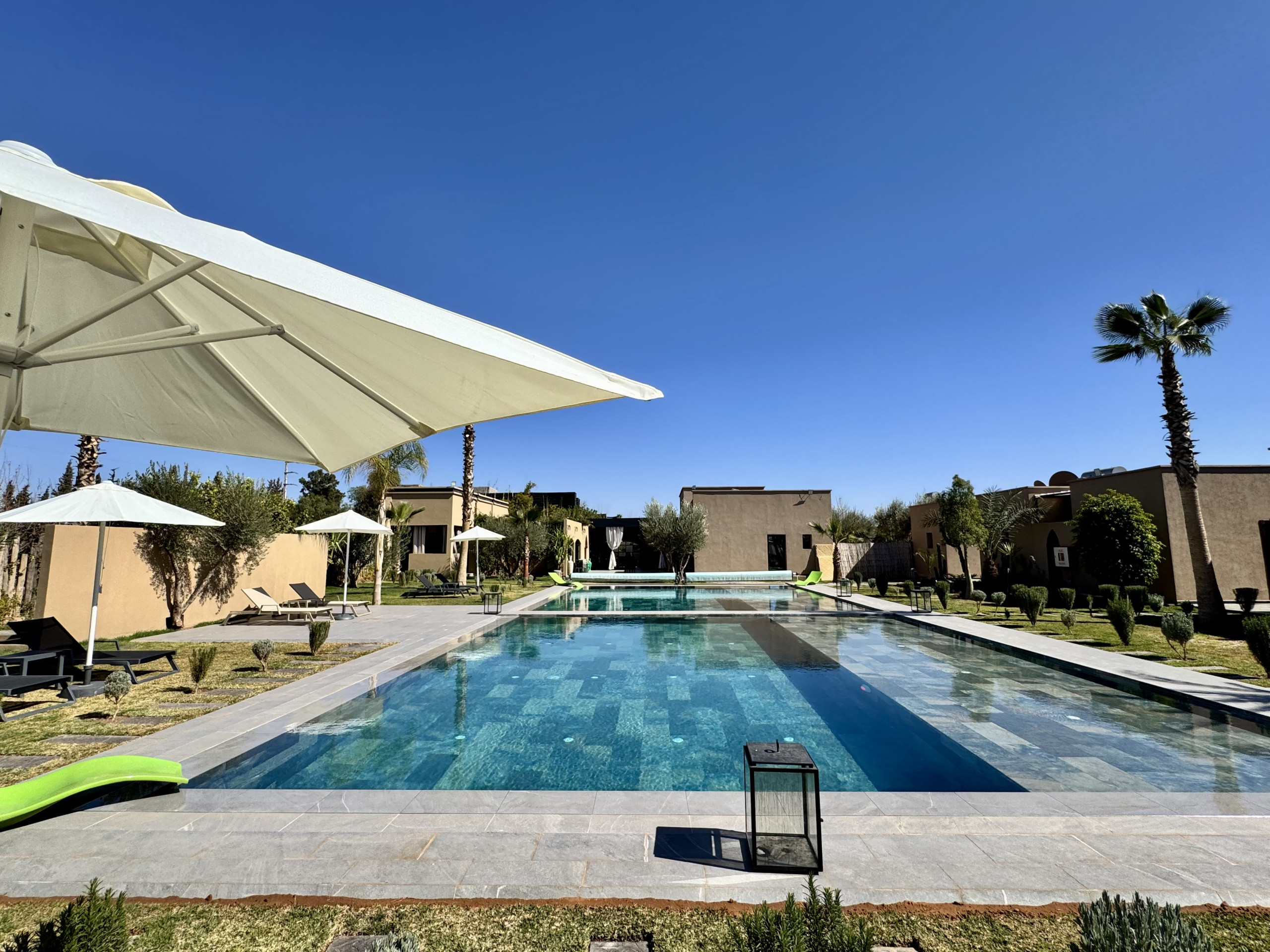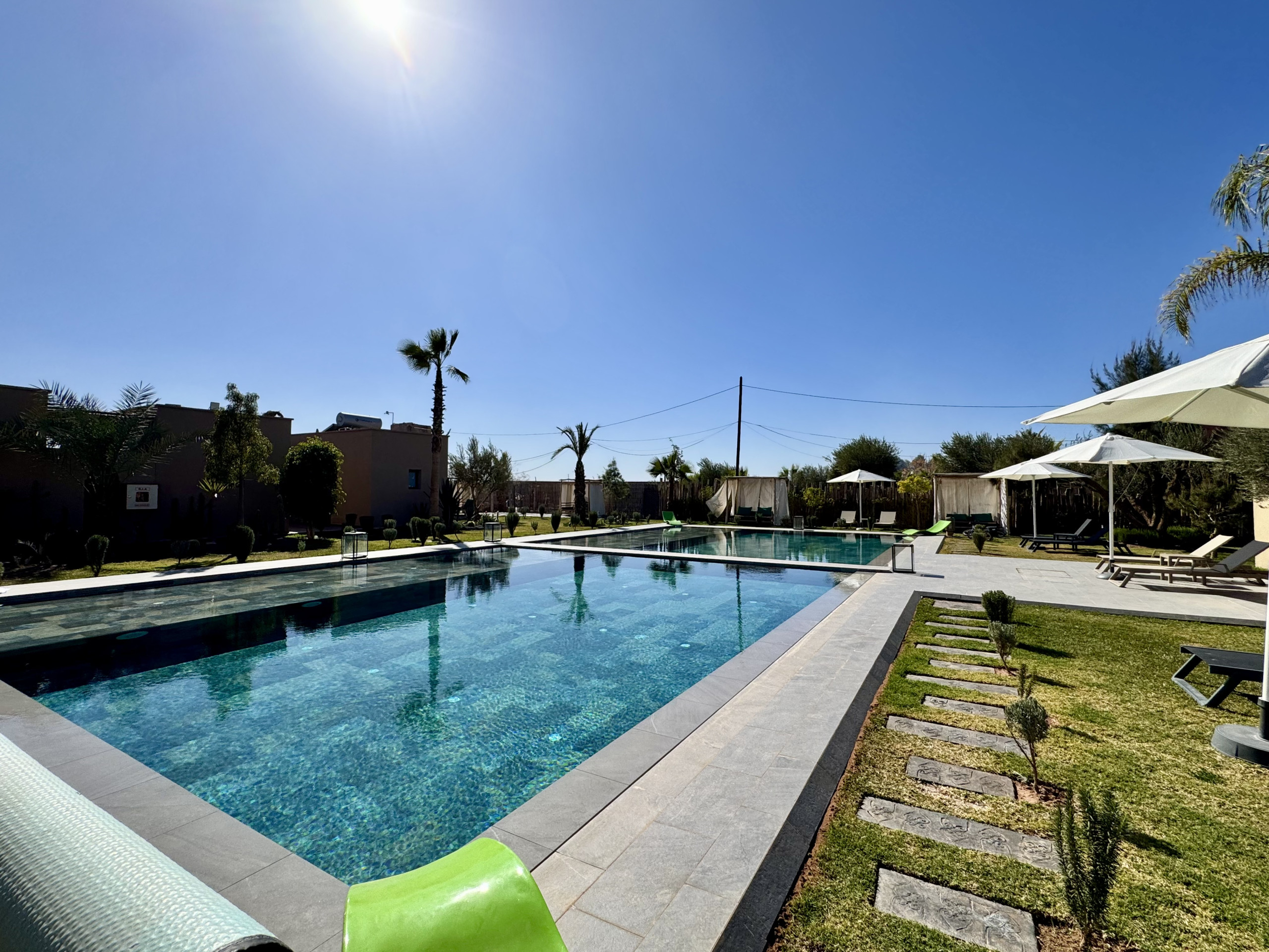 The CLOS DES ÉTOILES located 15 minutes from the Royal Golf and Amelkis less than 30 minutes from Marrakech, welcomes you all year round for your group stays, with friends, family or for all your small private events and events. company. The Villa offers unique reception capacities in Marrakech, thanks to its huge living room serving as a modular banquet room that can accommodate all the guests at the table. Its huge swimming pool and its shaded terrace, decorated with a pool house and a fully equipped outdoor kitchen, as well as its garden with trees and flowers, will enhance your stay. The Domaine can accommodate 14 people in its 7 very comfortable rooms.